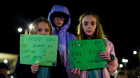 Willow Crawford, left, her sister Ava, right, and friend Kaylynn Vestre show support for Richneck Elementary School teacher Abby Zwerner during a vigil in Newport News, Va., Jan. 9, 2023. Zwerner was shot and wounded by a 6-year-old student Jan. 6. (AP)