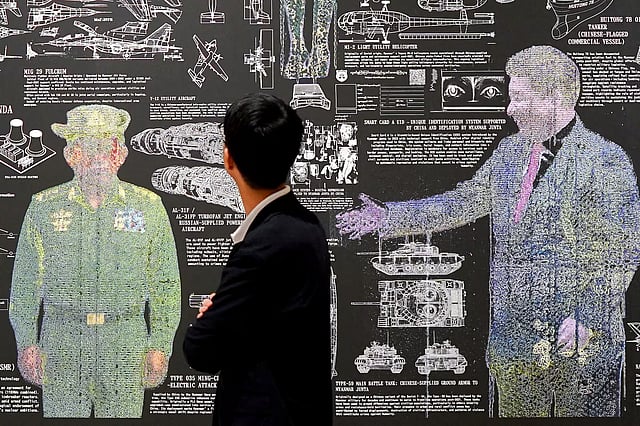 Sai, co-founder of Myanmar Peace Museum, the organization that put together the exhibition, said the removed pieces included Tibetan and Uyghur flags and postcards featuring Chinese President Xi Jinping, as well as a postcard depicting links between China and Israel.
