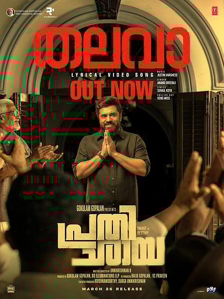Nivin Pauly, who took to his social media timelines to share the link to the lyrical video of the number, wrote, "Presenting the vibrant “Thalava” Lyrical Video. Composed by Justin Varghese and directed by Unnikrishnan B, this track blends energetic beats with catchy lyrics, delivering a refreshing musical vibe.#Prathichaya arrives in cinemas on March 26."