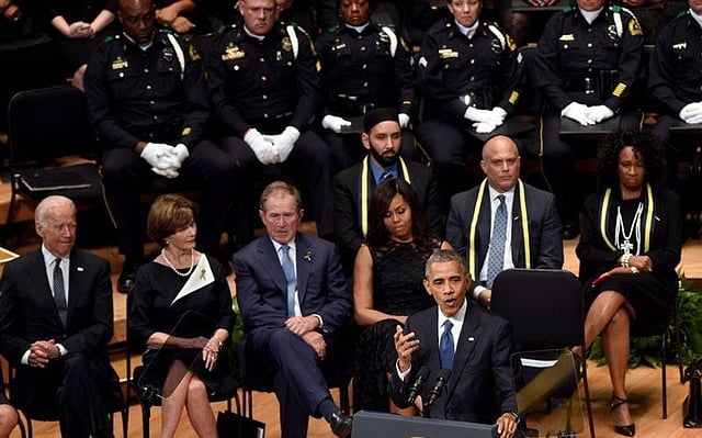 The meeting was called in response to harrowing events last week that have many Americans anxious and upset. Two black men were shot by white police officers at point-blank range in the states of Louisiana and Minnesota; five white police officers were then shot at a rally in Texas protesting against those shootings, by a black gunman who said he wanted to kill white people.