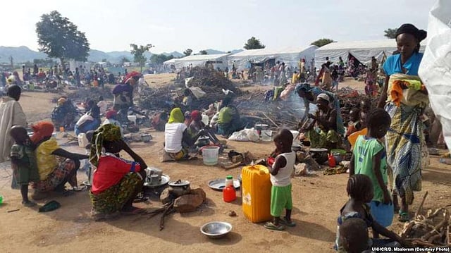 A family of refugees that fled their homes due to violence from the Islamic extremist group Boko Haram sit inside a refugee camp in Minawao, Cameroon, Feb. 25, 2015. VOA