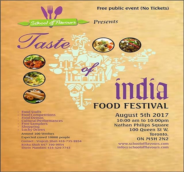 July 28, 2017: The Taste of India food festival is to be held in Toronto this year on August 5th. The food festival is brought by the collaboration of Young Canadian Alliance and School of Flavors.