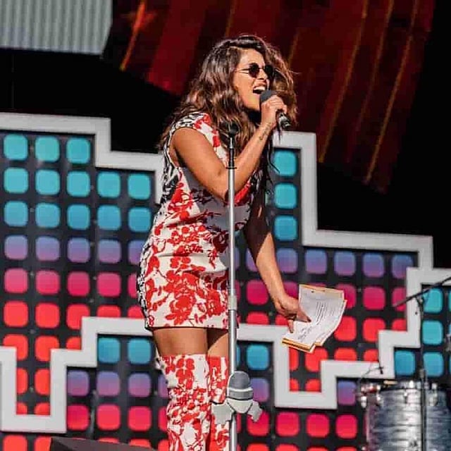 Clad in a red, white and black floral mini shift dress with thigh high boots in the same print, Priyanka, 35, was excited about the festival. Her long brown hair was worn loose in soft curls and she wore round sunglasses for the event at the Central Park here on Saturday, reports dailymail.co.uk.