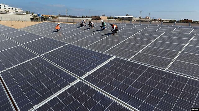 Workers install photovoltaic solar panels at the Gujarat solar park under construction in Charanka village in Patan district of the western Indian state of Gujarat, India. VOA