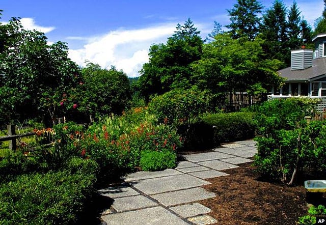 The front lawn of this home was reclaimed using shrubs, trees, flowering perennials and a walkway rather than turf grass, in Langley, Washington. VOA