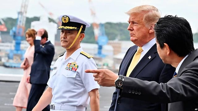 Japanese Prime Minister Shinzo Abe, on Tuesday morning, hosted Trump on the deck of the JS Kaga, one of Japan's helicopter carriers that will soon be converted to carry a short takeoff/vertical landing variant of the American-made F-35 supersonic stealth jet fighter.