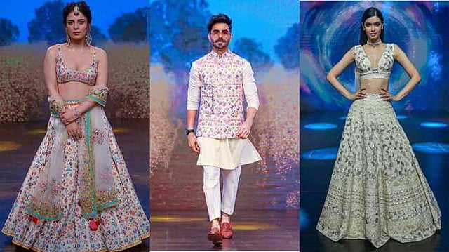 Radhika and Aparshakti from B'town were showstoppers of designer duo Sukriti and Akriti's show. They unveiled their "Neo-Phulkari" collection that focused on the traditional, vibrantly, colored, embroidery technique that originated in Punjab. Keeping the silhouettes Indian, the duo has used organic fabric as the base and naturally dyed gota work.