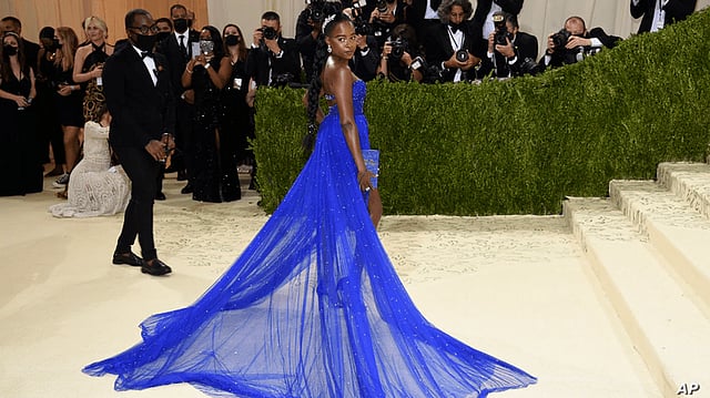 Gorman's dress, which included more than 3,000 hand-sewn crystals, was made to evoke a starry night sky. She told Vogue she felt like Lady Liberty, reimagined. Her crown, the star poet said, was a nod to publishing. Another of the hosts, Naomi Osaka, wanted to celebrate all her cultures — Japan, Haitian and the U.S. — and picked a Louis Vuitton gown designed in collaboration with her sister, Mari Osaka. It was a swirly blue, aqua and purple print with long black ruffle sleeves and a wide red sash.