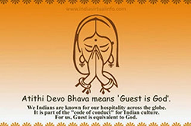 In Sanskrit, the word atidhi means- one who has no fixed day for coming. In all cultured and refined societies, honoring a guest is considered as an important duty of a householder. The Hindu scriptures have extolled a guest as God himself (Taiṫṫirīya Upanishad). Out of the five daily sacrifices (pancha mahāyajnās) a householder is ordained to perform, mānushya-yajna the fourth one, concerns the feeding and the taking care of guests.