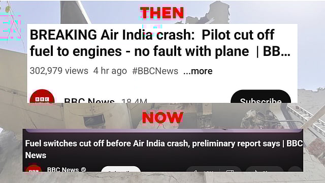 Barkha Dutt, Indian TV journalist and author, said in a post on X that every expert and pilot she has spoken with off-record noted that photos from the crash site showed the fuel switches in the ON position, indicating an attempt to recover engine power, rather than pilot error. As per Boeing’s own emergency procedures, pilots are trained to cycle the fuel switches off and on during dual engine flameouts—a possible explanation for the switch movement. Bharkha Dutt also called out BBC for it's misleading headline saying "Pretty shocking to see this scurrilous headline. In fact the report mentions an FAA advisory on a fuel lock problem in Boeing planes which oddly it does not then advise further investigation on."
