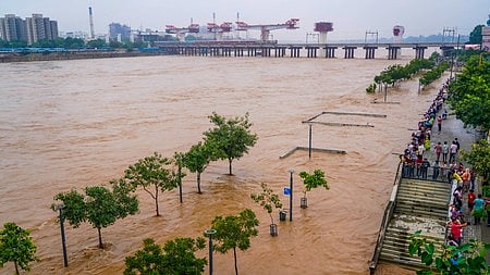 The inflow from upstream, including Dharoi and Sant Sarovar, crossed 1.20 lakh cusecs, forcing the opening of 27 gates of the Vasna Barrage to divert water downstream toward the sea through Ahmedabad district. As a result, the lower promenade of the Sabarmati Riverfront was submerged.