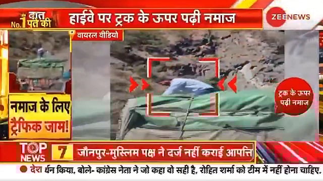 The programme repeatedly played the video and stated that the other side of the highway was empty because no one else had stopped to pray. Although the reporter mentioned that the video was viral and not independently verified, the anchors’ commentary implied that the prayer had led to public inconvenience and called for action. The broadcast also featured captions such as “Truck par namaz, highway kiya jam” and “Khadi rahi gaadiya, log hue pareshan”.