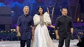 Shantanu & Nikhil: The design techniques of Indra are a seamless integration of the signature Shantanu & Nikhil ethos, the intricacy of Indian craftsmanship and a global perspective on contemporary fashion. The colour palette starts earthy, alluding to the severity of the drought and scarcity of water. As the show goes on, there is a rapid transformation to water- and the mighty force of Lord Indra. There are free-flowing silhouettes in shimmering silk, drapes and tassels and intricate metallic elements that create a transcendental aura, all tied together by Shantanu & Nikhil's craftsmanship.