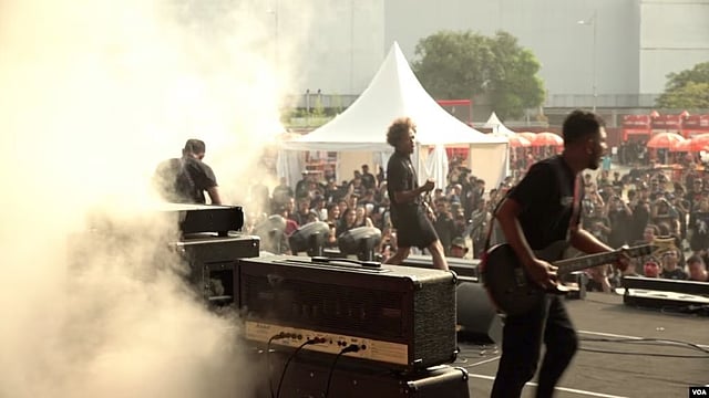 Sisi Selatan is a heavy metal band from the Indonesian city of Solo. The group performed songs about love and social activism while fans in front of the stage jumped up and down. Band members say Indonesia is a country that embraces foreign cultural influences.