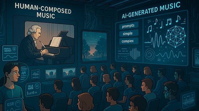 The research compared the reactions of people when watching videos accompanied by different types of music. During the experiment, 88 participants watched audio-visual clips with identical visuals, but three different sound conditions: music composed by humans, AI-generated music with complex and detailed prompt, and AI-generated music with a simple and less detailed prompt.