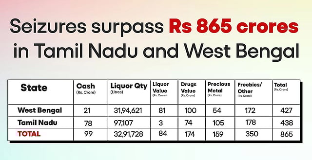 Enforcement agencies have seized inducements worth ₹865 crore in West Bengal and Tamil Nadu since February 2026. The seizures include cash, liquor, drugs, precious metals and freebies.