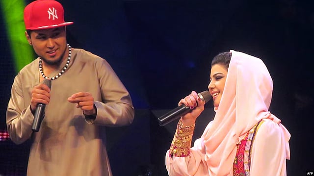 Afghan singer Zulala Hashemi (r) performs alongside competitor Sayed Jamal Mubarez (l) during the television music competition Afghan Star.
