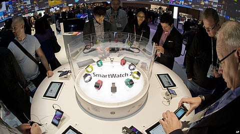 FILE – A woman shows a prototype of the Mota Smart Ring at the consumer electronic fair IFA in Berlin, Germany, Sept. 5, 2014. The smart ring is designed to notify users about incoming messages and phone calls, something, experts say, can be used to cheat on exams.