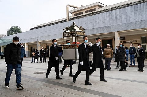 Staff members carry an urn in a funeral procession outside a crematorium of a funeral home in Chengdu, Sichuan province, China, Wednesday, Dec. 28, 2022.
