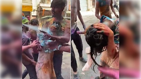 In the video, the youth could be seen grabbing the woman and smearing colors on her amid chants of 'Holi Hai'. A boy could also be seen smashing an egg on her head, even as the woman shouted 'bye bye' just to escape from the spot.