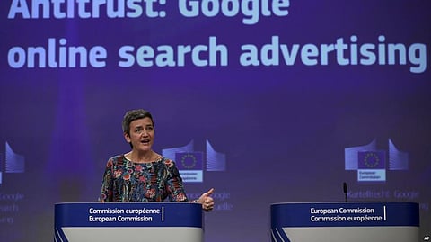 The EU's competition commissioner, Margrethe Vestager, announced the results of the long-running probe of Google's AdSense advertising business at a news conference in Brussels on Wednesday.