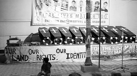 New Delhi: Nine civilians allegedly killed in police firing in Churachandpur district of Manipur are yet to be buried and for the past one month people of tribal communities of the North Eastern state have been protesting at Jantar Mantar with nine coffins of the slain people.