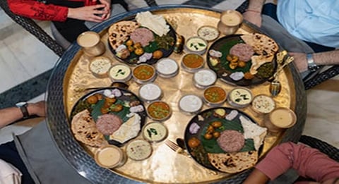 Pahadi Thal offers a curated multi-course tasting menu that promises an unparalleled dining experience. What sets it apart is the use of a communal Kansa Thal, a bell metal plate deeply rooted in Ayurveda, believed to enhance intellect and cure acidity. The communal aspect encourages diners to share their meal, fostering an atmosphere of togetherness and connection.