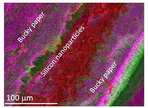 "The freestanding sheets of carbon nanotubes keep the silicon nanoparticles electrically connected with each other," explained Shailendra Chiluwal, a graduate student at CNI and the first author on the study.