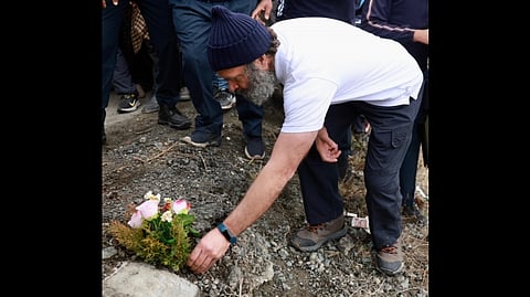 Congress leader Rahul Gandhi on Saturday paid floral tribute to the martyrs of 2019 Pulwama terror attack at Lethpora.