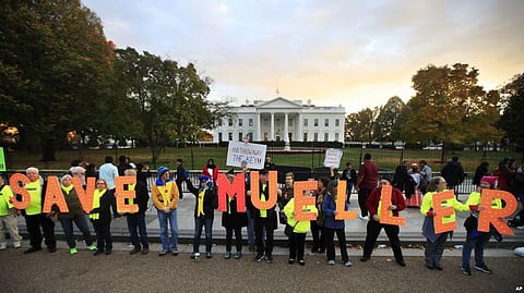 Protesters urging the White House not to impede Robert Mueller's probe into Russian meddling gathered outside the White House and in Lafayette Park, just north of the White House, in Washington. VOA