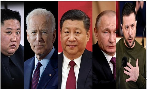 Left to Right (Kim Jong Un, Joe Biden, Xi Jinping, Vladimir Putin, Volodymyr Zelensky)- Salil Gewali