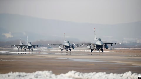 FILE - U.S. Air Force F-16 fighter jets take part in a joint aerial drills between U.S and South Korea, at the Osan Air Base in Pyeongtaek, South Korea. A bipartisan group of U.S. lawmakers is pressing President Joe Biden to send F-16 planes to Ukraine. (AP)