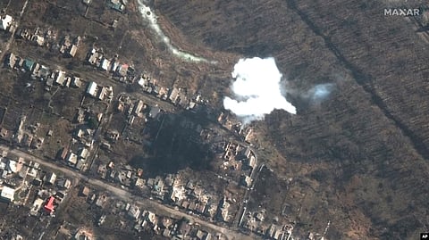 This satellite image provided by Maxar Technologies shows smoke from recently dropped ordnance in southern Bakhmut, Ukraine, Monday March 6, 2023. (Satellite image ©2023 Maxar Technologies via AP)