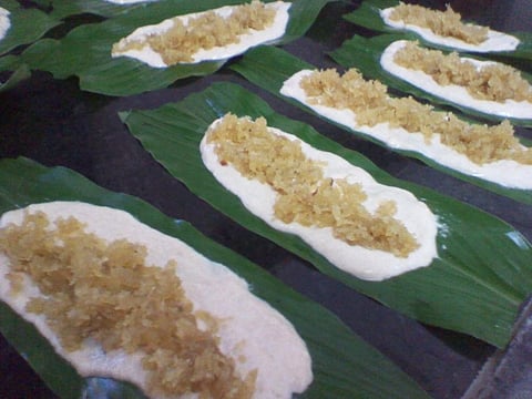 The rice is first boiled and kneaded into a paste and smeared on the turmeric leaf, the rest of the ingredients are boiled in a little water until the stuffing is cooked. It is then wrapped into the turmeric leaf and steamed for around 20 minutes.
