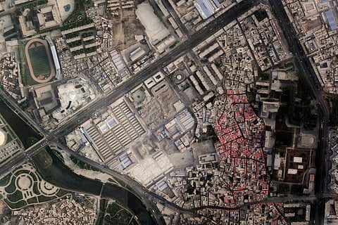 An RFA analysis of satellite images of the Grand Bazaar provided by PlanetLabs Inc. shows dramatic changes in the market, including the removal of buildings and the roofs of stalls, between photos taken on April 4 and May 4.